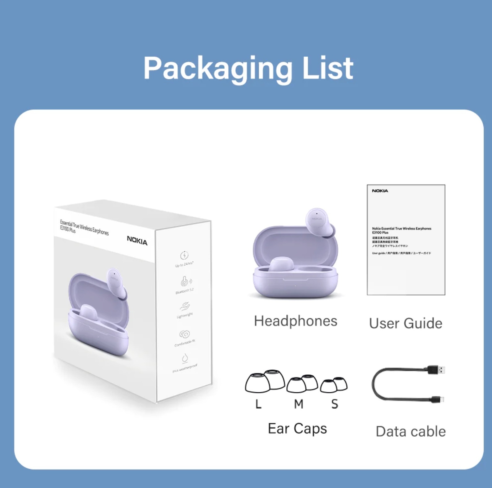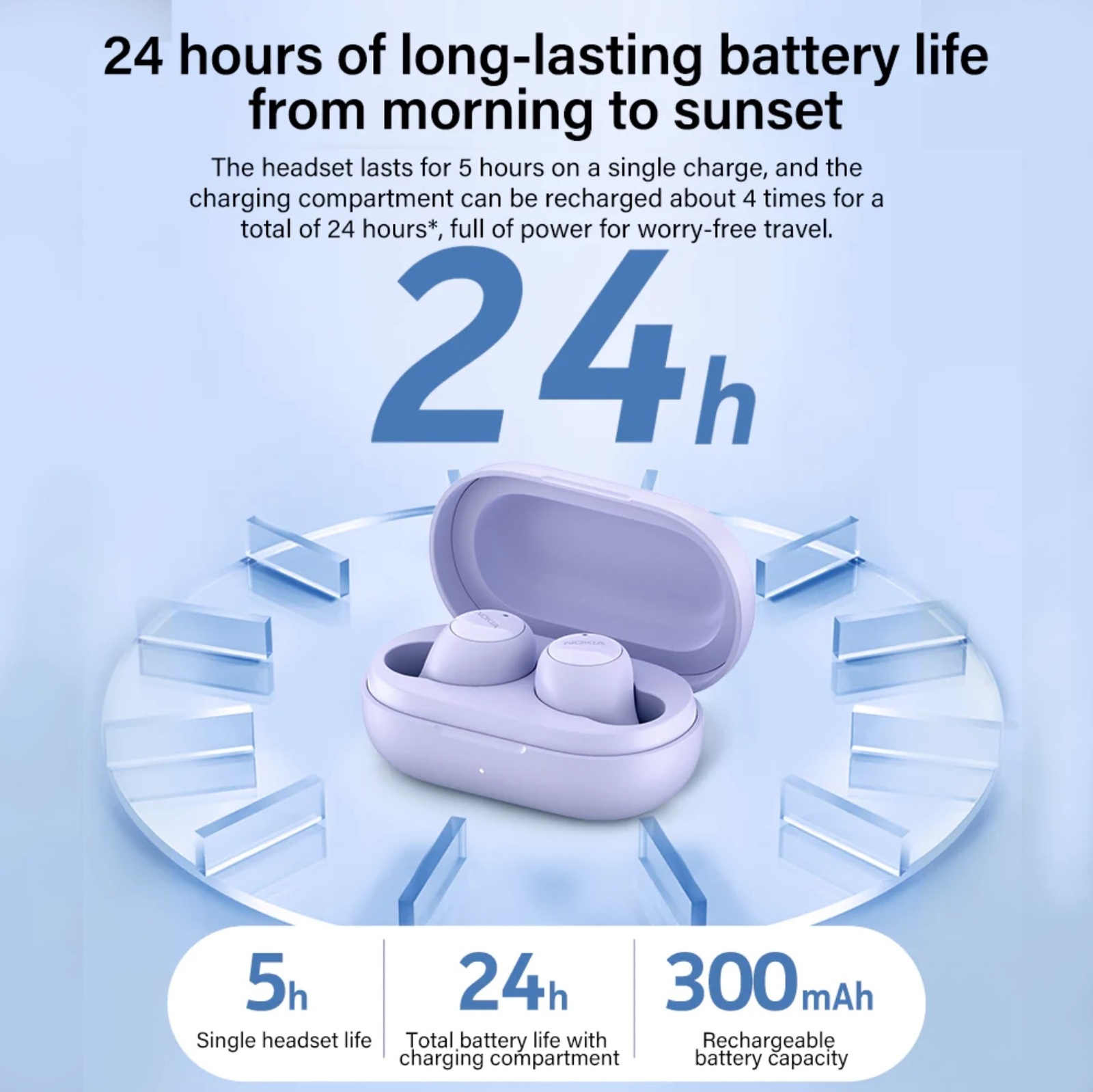 The E3100 Plus connects you with music all day long. It gives you up to five hours of play-time and 19 more with a fully charged battery case.